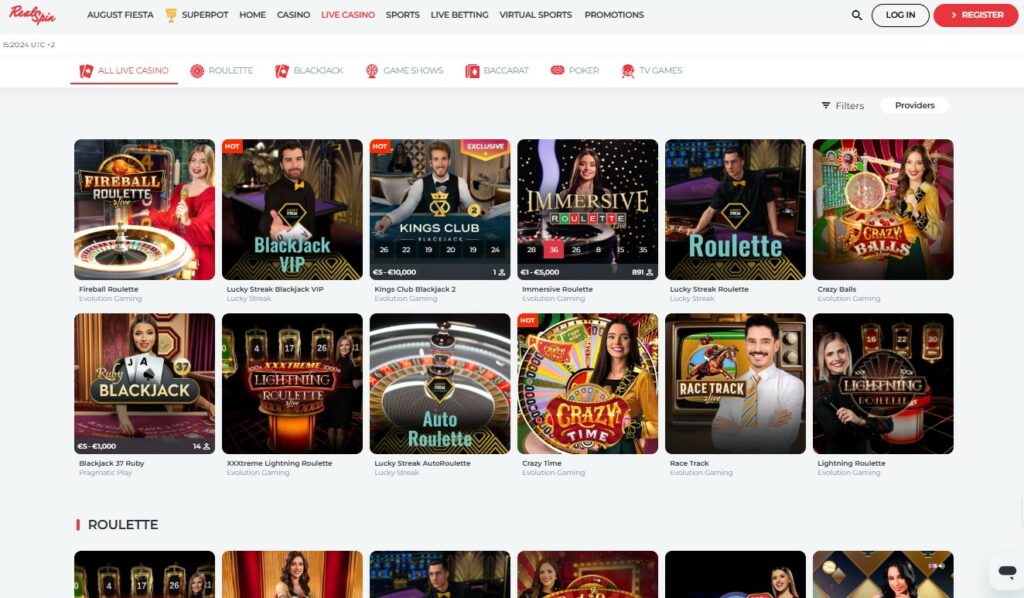 The live casino section at RealSpin provides an authentic casino experience from the comfort of your home. Powered by Evolution Gaming, Pragmatic Play Live, and Ezugi, the live dealer games include multiple variants of roulette, blackjack, baccarat, and poker.